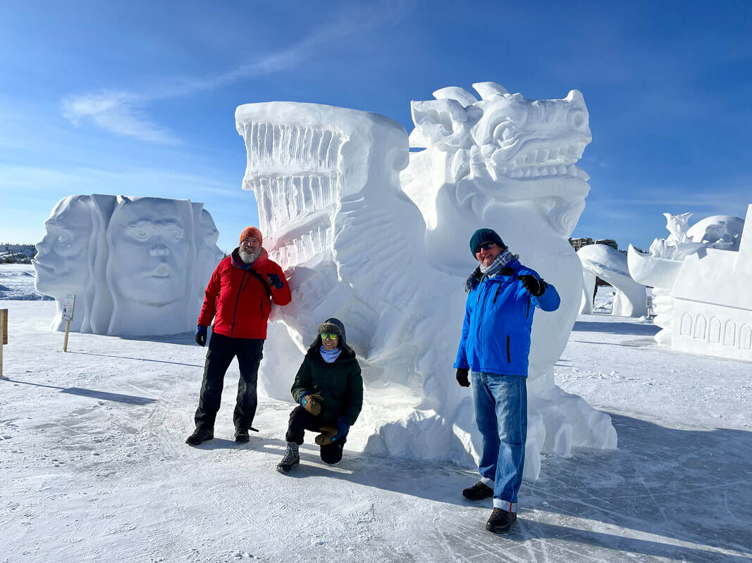 Here’s Marin and her teammates Mark (London, GB) and Roger (PA, USA), beside their amazing wyvern-with-a-twist snow sculpture!