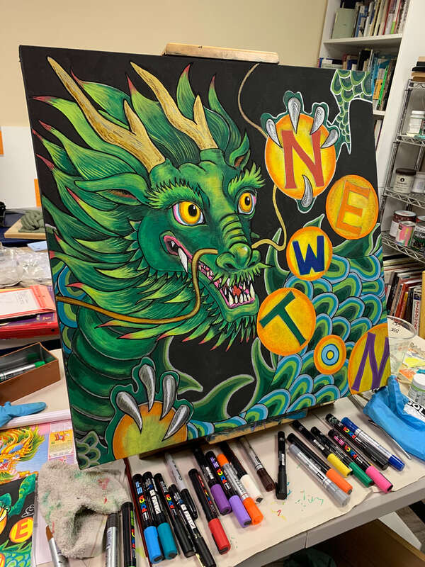 Dragon illustration in progress by Marin Murakoshi, for a selfie station backdrop