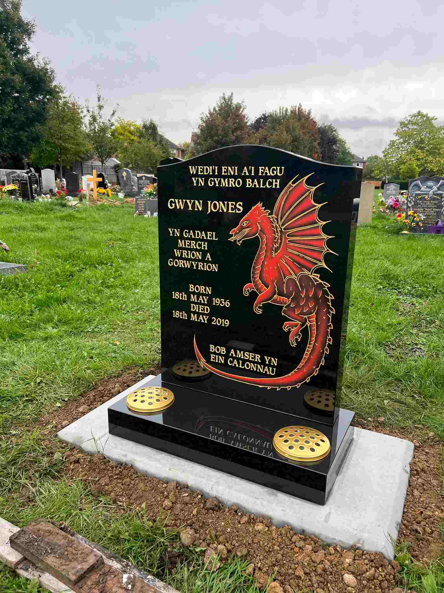 While I didn’t see any dragon tombstones in my area, here’s a pic of a very unique, handmade addition to a stone.
