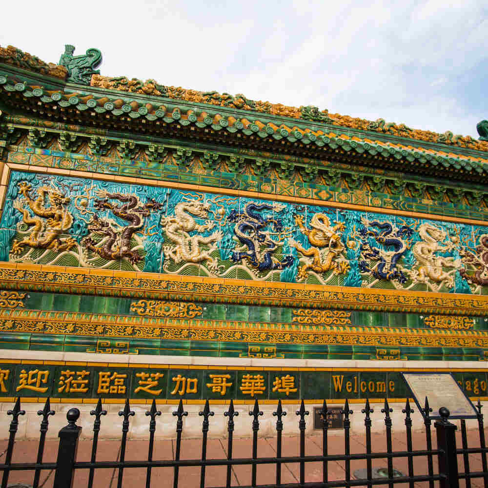 About Nine Dragon Wall: This wall is made of glazed tile from China and is modeled after the wall in Beihai Park in Beijing. The Chinatown mural replicates the large dragons and over 500 smaller dragons. The Nine Dragon Wall is one of the only three such replicas outside of China.