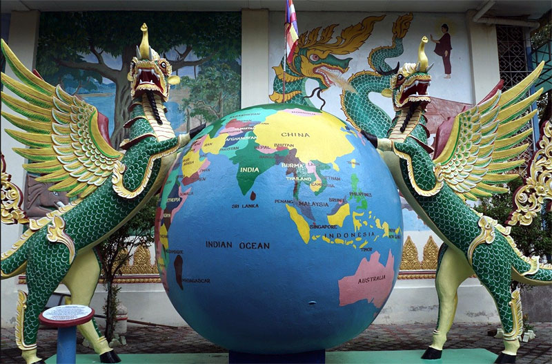 The second photo of the globe with 2 Kilins / Qilin dragons with wings is of the Dharmikarama Burmese temple opposite the Reclining Buddha Wat.